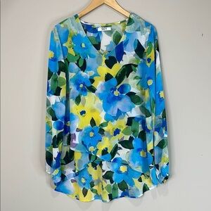 Suzy Shier Floral Chiffon Tunic Top Bright Blue Yellow Crossover Hi Low Hem M