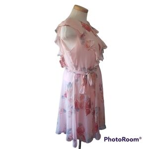 Suzy Shier floral midi dress with ruffles and tie belt. Sz XXL. Ruffles down the bodice. Sleeveless. Side zipper. Sheer but fully lined. Spare button. Keyhole button closure in back. 100% Polyester. Approximate flat lay measurements: pit to pit 21", waist 19", shoulder to hem 43". Last 2 photos show some tiny specks in lining and a blue colour transfer spot. Smoke free home.