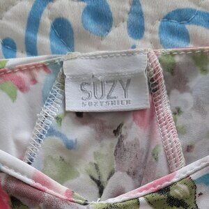 Lovely Suzy Shier tiered floral top in shades of pink, blue, green and grey. Size M. 93% polyester, 7% spandex.