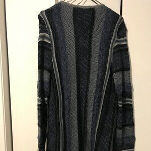 The cardigan is 100% acrylic. The colors are light and dark grey, black with silver threads throughout. The length of the cardigan is 31"