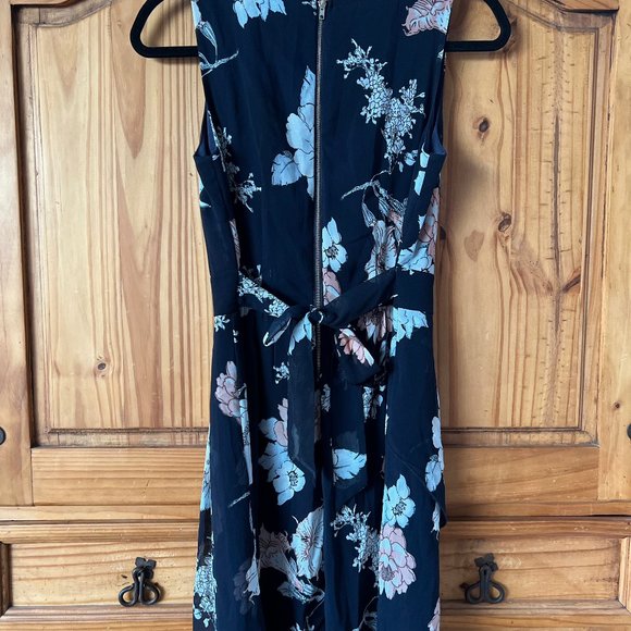 Suzy Shier Navy Blue Floral Dress โ Size Small, Tulip Hem & Tie-Back, Elegant St