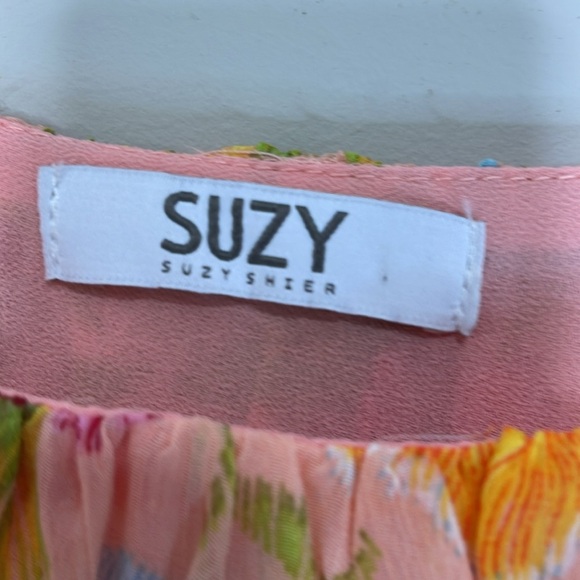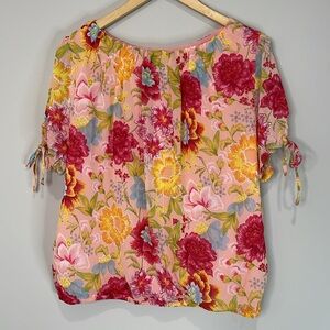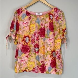 Suzy Shier Plisse Floral Blouse Tied Sleeves Pink Red Yellow Elastic Waistband L