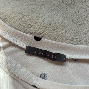 Add a pop of femme flair to your closet with this Suzy Shier polka dot ruched long sleeve top, Size Large, in great condition. Featuring a ribbed texture, adjustable side drawstrings, and a classic crew neckline, this piece blends flirty vibes with comfortable stretch.