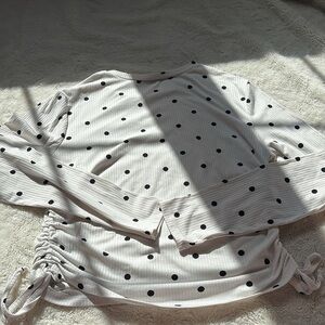 Pit to pit 18” Add a pop of femme flair to your closet with this Suzy Shier polka dot ruched long sleeve top, Size Large, in great condition. Featuring a ribbed texture, adjustable side drawstrings, and a classic crew neckline, this piece blends flirty vibes with comfortable stretch. The black polka dots on crisp white fabric offer a timeless yet playful look, while the ruched sides let you customize the fit for a snatched silhouette or a relaxed drape. Perfect for pairing with denim, trousers, or skirts, it’s a versatile pick for fresh outfit edits. 📌 Highlights: • Size L – flattering & flexible fit • Polka dot print – bold & trending ✅ • Adjustable ruched sides – style your way • Ribbed texture – soft & stretchy • Great condition – gently worn, no flaws • Ideal for casual styling, date night, or layering