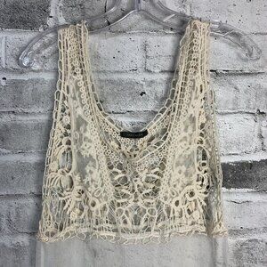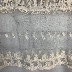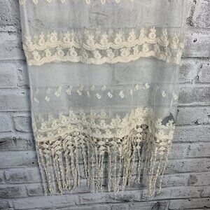 Suzy Shier Y2K Boho cottage core cream sheer mesh crochet tasseled scoop round neck below the knee sundress, beach coverup, tank dress.