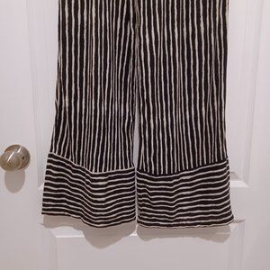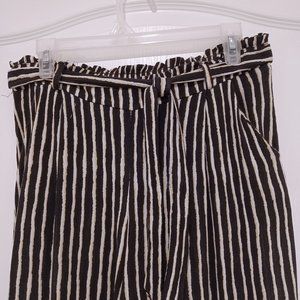 Awesome, wide-legged striped pants with fabulous cuff detail. Crepe-paper feel fabric. Pockets on both side, elastic waist band. Belt included. Black, tan, and white stripes.