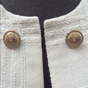 Chic white blazer with gold button details and textured material. Perfect for elevating any look.