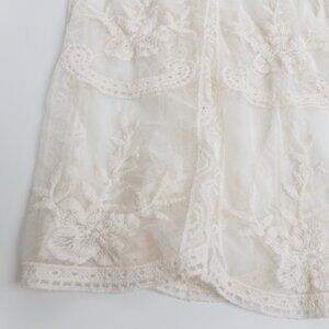 Beautiful and delicate Suzy Shier embroidered mesh kimono in a soft off-white/ivory shade. Features an all-over floral lace design, sheer mesh body, flutter sleeves, and a front tie closure