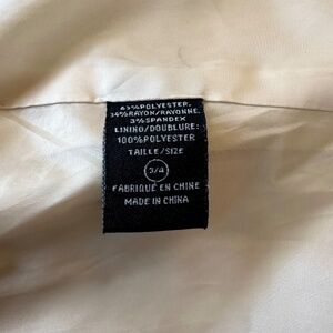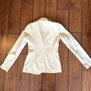 Like new creamy Suzy Shier 3-button Blazer in a size 3/4. It fits like a size Small. This blazer is comfortable and it has long enough sleeves for those with long arms like myself who always struggle finding tops with long enough sleeves.