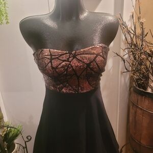Suzy Shier strapless dress with gold toned sequin detailing on top portion