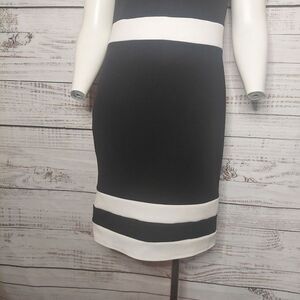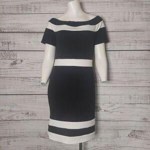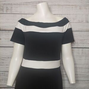 The image shows a Suzy Shier black and white dress with a bateau neckline. The dress features a color block design with horizontal white stripes at the shoulders, waist, and hem, contrasting against the black fabric of the bodice and skirt. The dress has short sleeves and a bodycon fit, ending around knee-length. The bateau neckline extends wide across the shoulders, and the dress is displayed on a mannequin. The background is a light-colored, horizontally paneled surface, possibly wood. Suzy Shier is a Canadian fashion retailer offering a range of women's clothing and accessories.