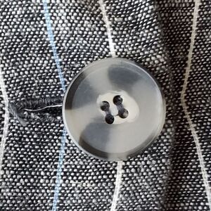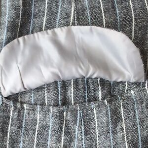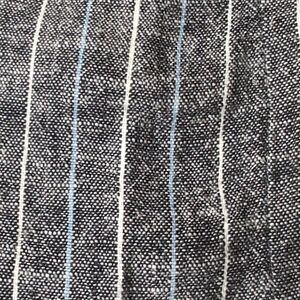 Stylish gray and white striped linen vest. Features a unique design with a soft white accent.