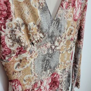 Lovely romantic roses and lace pattern stretchy double layer mesh lettuce frill edge poly dress from Suzy Shier. Long sleeves. Soft feel. Fully lined body, sleeves are unlined. Some nice structure at bust and V neck collar. US size M. Excellent preloved condition Like New!
