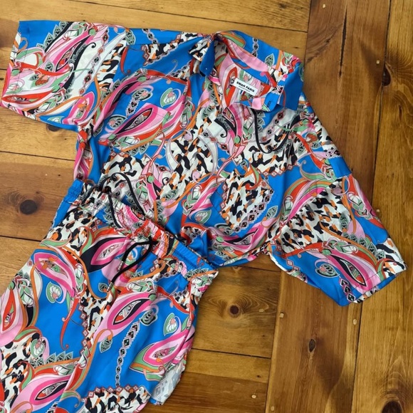 Vibrant shirt and shorts set with a colorful pattern. Small fabric run on back of the shirt and tiny stain on the front. Please refer to photos! Shirt size 1, pants size 2 with elastic waist.