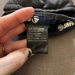 Worn for snowboarding for 2 seasons by my little. These high quality mittens are the best at keeping fingers warm! They are a combo leather and polyester with adjustable wrist strap and a pocket for hand warmers.