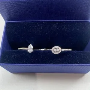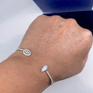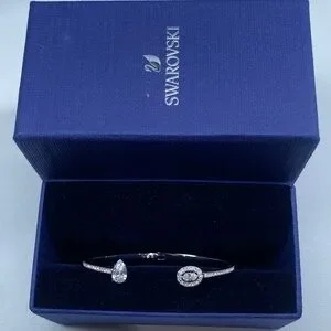 The timeless elegance of Swarovski craftsmanship and a contemporary asymmetrical silhouette combine with aplomb in this stunning open-shank bangle. The hinged rhodium-plated design is punctuated with a pear-shaped clear crystal at one end and an oval-shaped stone at the other. Sparkling pavé adds luxurious finish to the cuff, which is simultaneously modern and classic.