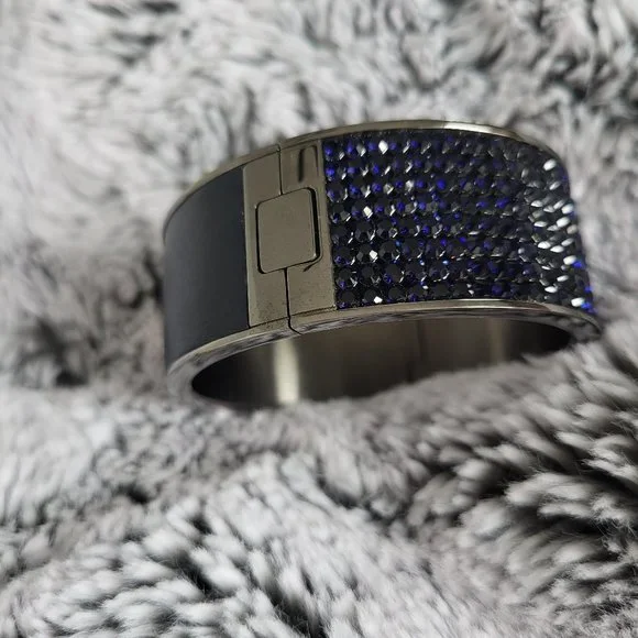 Swarovski wide Intervalle Bangle in dark blue. Clasp in the middle, one side is crystals and the other is a leather band. Never been worn, but no longer have the box.