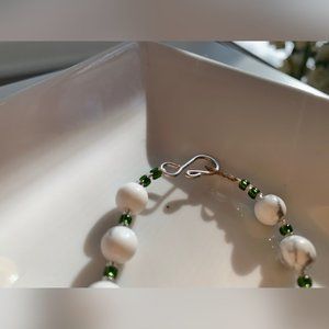 A beaded white and green handmade necklace with marble details and a hook clasp. The beads are Swarovski. Perfect for any dresses.