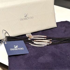 Meet your new “OMG, where did you get that?” bracelet! This stunning Swarovski piece mixes edgy black leather with luxe rose gold, yellow gold, and rhodium-plated accents — each bar sparkling with rows of signature Swarovski crystals. It’s the perfect blend of rocker-chic meets glam sophistication.