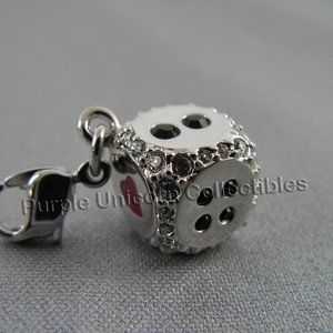 This cute little rhodium-plated dice (or die) features clear crystal pave on the corners and sparkling Jet black crystal pips on five sides. Instead of a single black crystal pip, the remaining side has an adorable red enamel heart.