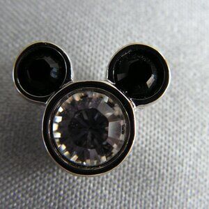 Approximately 5/8" across and 1/2" high in the iconic shape of Mickey's head, the silver-tone pin features one large clear crystal for the head and two smaller black crystals for the ears.