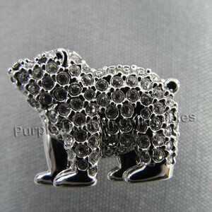 The pin is approximately 13/16" across and features clear pave crystals on rhodium plate.