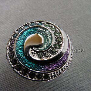 The pin is approx 1/2" in diameter and features a swirl of clear, pink, blue and green crystals, and another swirl of glittering enamel in various shades of purple, blue, aquamarine, turquoise and green.