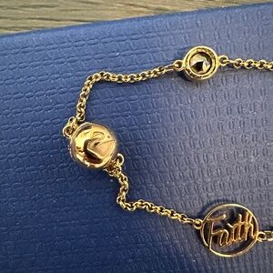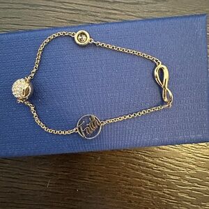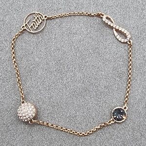 Rose gold bracelet with infinity knot, faith message, blue stone and Swarovski crystal details.