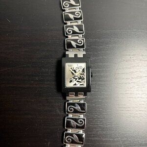 Swatch watch with black floral paterns. Case is in polymer and band is stainless steel