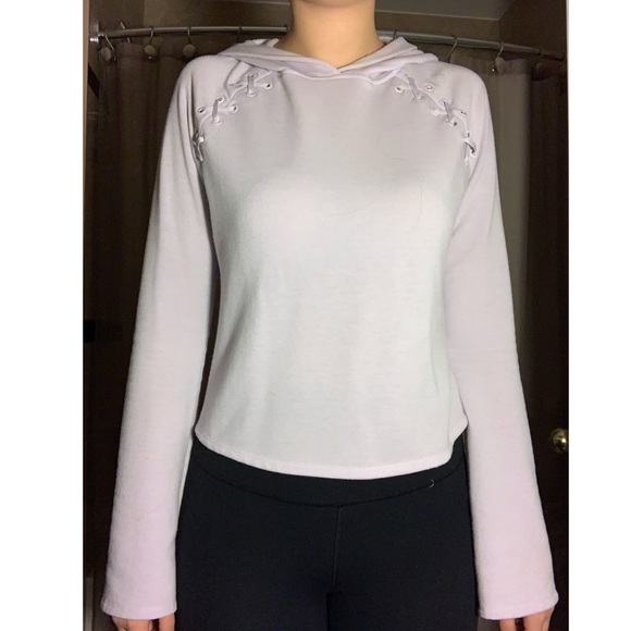 Lilac coloured sweater with sown laces on shoulders. Ends of sleeves are a bit wider as a design. Size S
