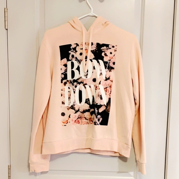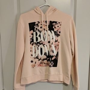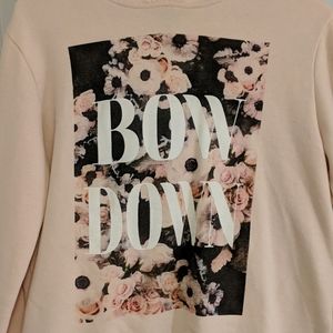 Light Pink hoodie. No pockets. Says "Bow Down".