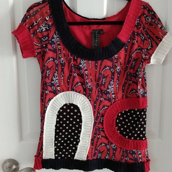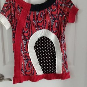 Short sleeves, main color red with motives in blue, white and black. Fabric is nylon and spandex, hand wash, warm iron on reverse.