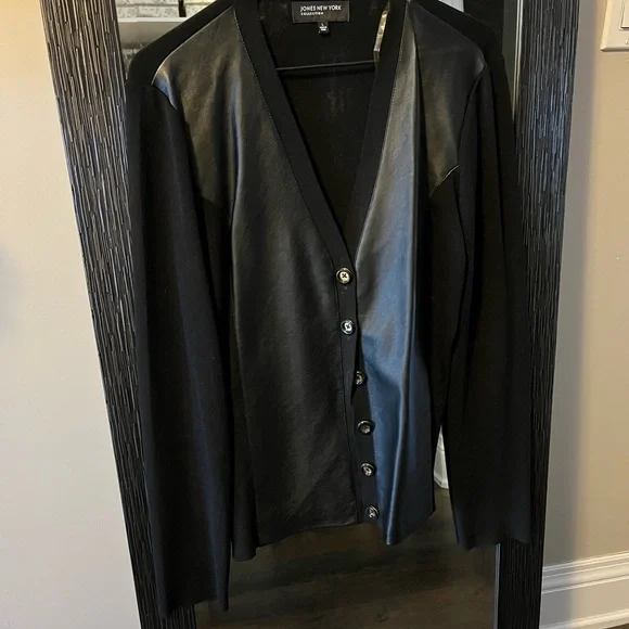 Cardigan sweater, v neck with 6 buttons. Leather insert in front , lightweight and easy to wear