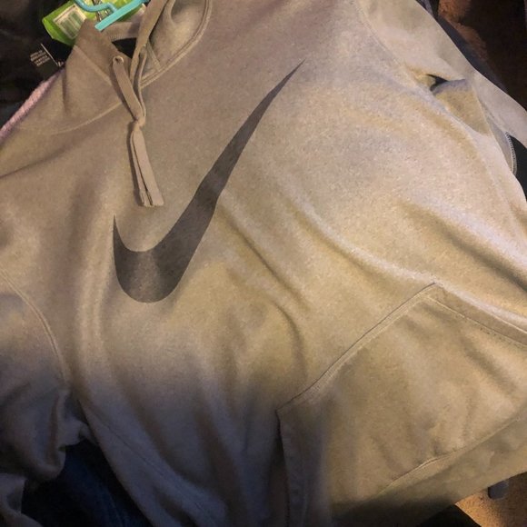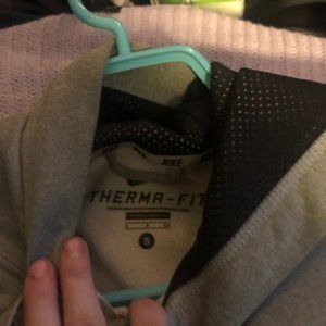 Athletic grey and black Nike sweatshirt. size small therma-fit sweater with small stain on front pocket very warm comfy material.