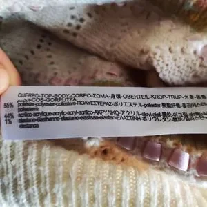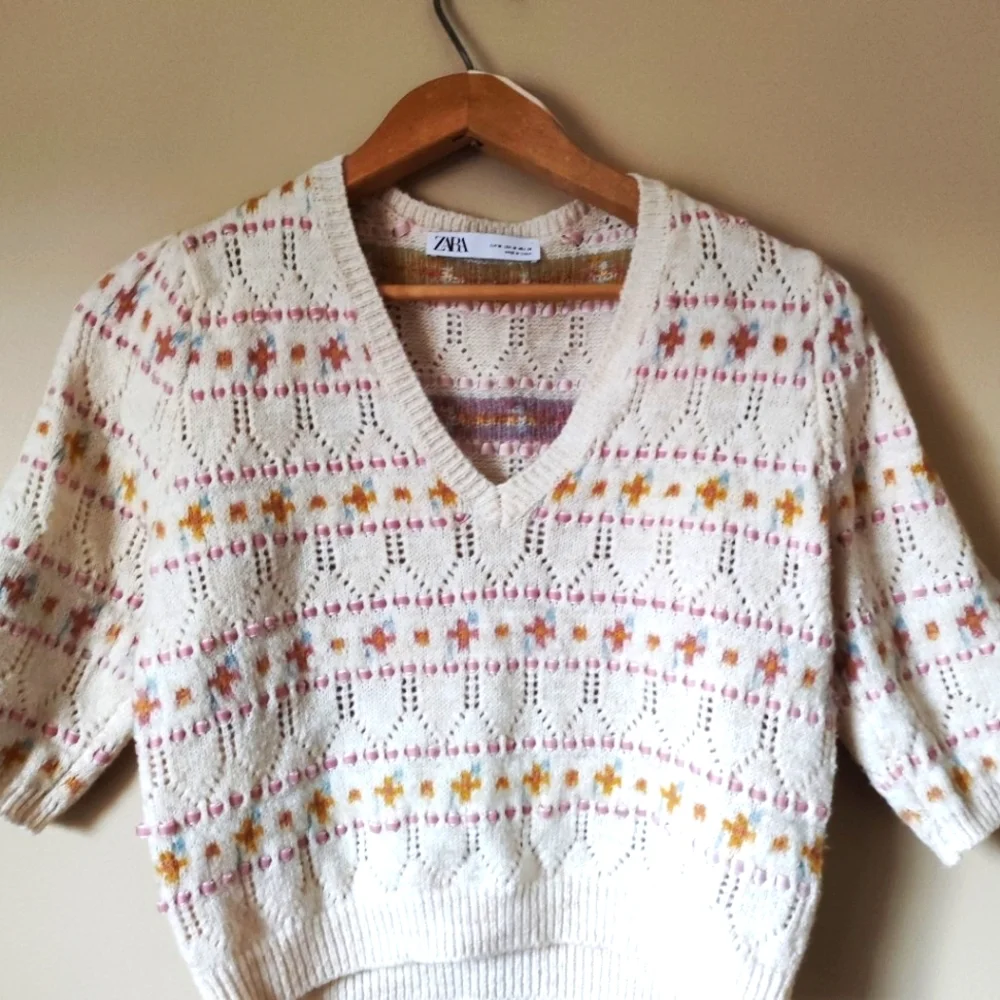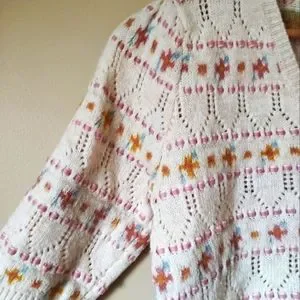 Colorful V-neck sweater, beige base with pink, orange and blue details and various details. Medium sleeves (elbow)