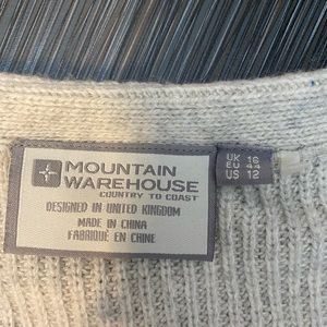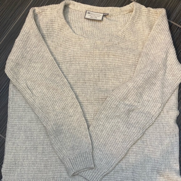 This oatmeal/grey sweater has a slightly shorter front and slits in the sides for comfort.