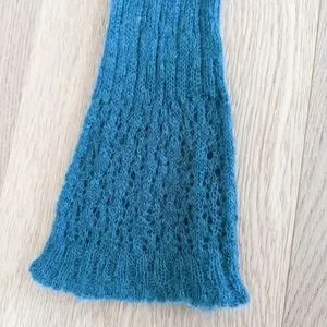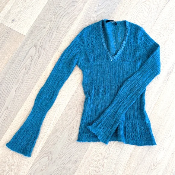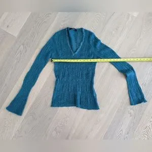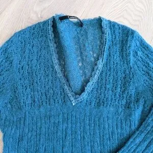 Eyelet style sweater with stretch. Can fit a small or medium. Velvet neckline. Very pretty!