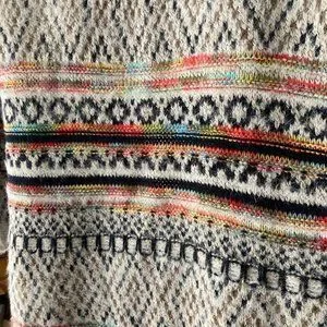 Comfortable, lighter weight sweater, duster-style. Dress it up or dress it down. Beige, browns and black with a wonderful rainbow of colours interweaved in rows through the sweater. The material is soft and drapes beautifully. A great fall addition to any wardrobe.