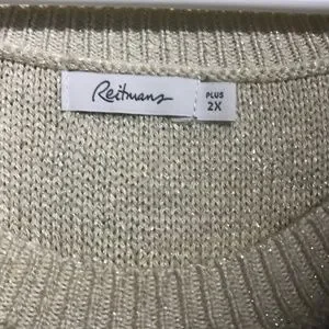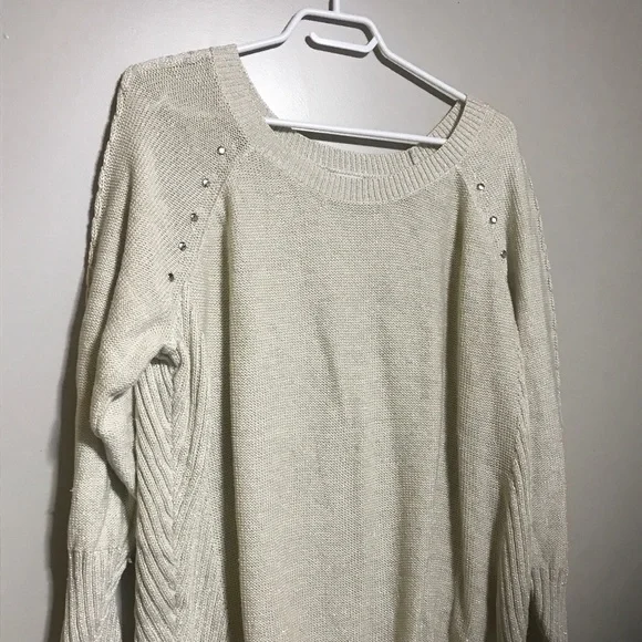 Beige sweater with a silver thread throughout and silver button detail on the shoulder.