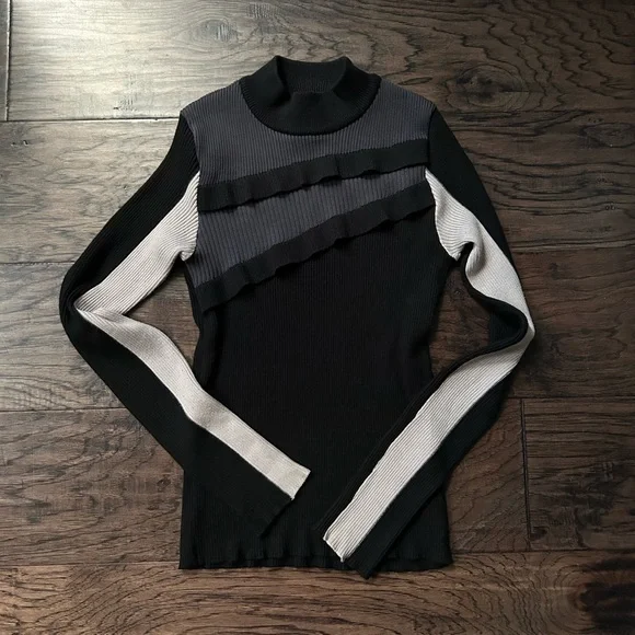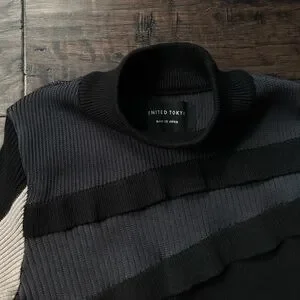 United Tokyo made in Japan black & cream white striped mock neck asymmetrical pattern design knit ribbed long sleeve fitted sweater
