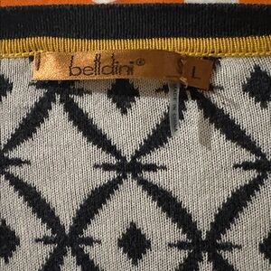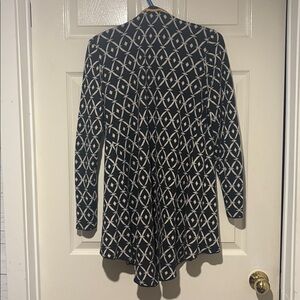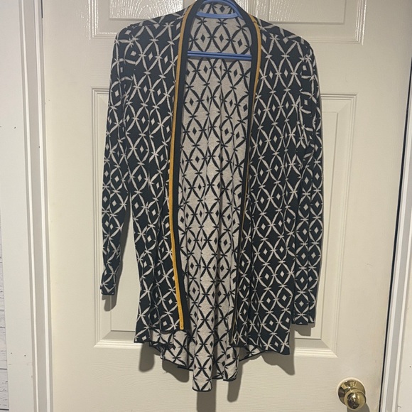 Open sweater longer in the back, black white winter with gold collar trim pit pit 24 inches