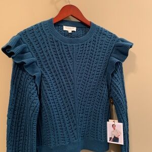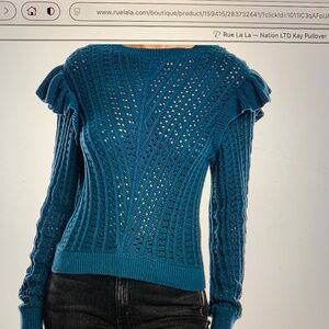 Nation LTD Kay Pullover, that combines beauty and comfort. This pullover in Italian Sea features open knit detailing, ruffle accents, and ribbed trim for a chic look. Made from 100% Pima Cotton, this pullover is machine washable and easy to care for. The Kay Pullover is approximately 24 inches [it is actually 21 inch long] from shoulder to hem. Model is 5'10.5 and is wearing a size small. Elevate your casual look with this versatile piece from Nation LTD. Made in Italy.