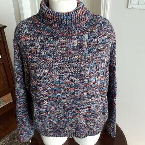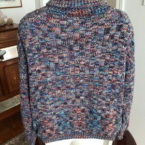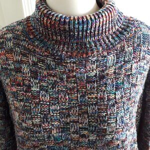 Gorgeous sweater in size Large by Elodie. Very colorful and looks fabulous with jeans! Turtleneck. Easy care 100% Acrylic. Measurements approximately in inches are: