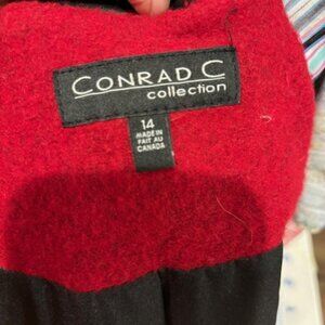 Acrylic wool blend in a striking ombre colour from red into black. Black knit sleeves. Faux leather lapel and collar. Black lining. Mint condition