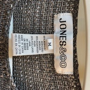Lovely weave silver-grey Jones & Co. sweater, size Medium. 45% acrylic, 35% nylon, 20% wool. Nice thigh length, great over leggings.