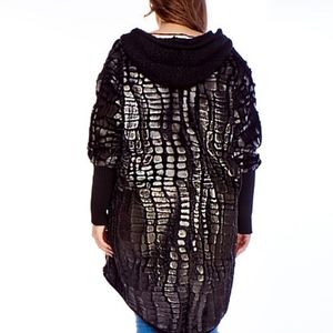 European design. Beautifully designed with this loose fitting blouse sweater and hood, round neckline, knitted sleeve cuffs. Very warm, lined.