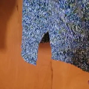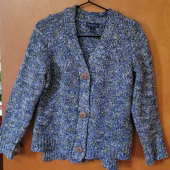 A lovely sweater knitted with variegated yarn. Winding River, size small. Real wooden buttons. This sweater is longer at the back! 100% acrylic. Hand wash cold water.