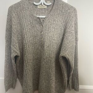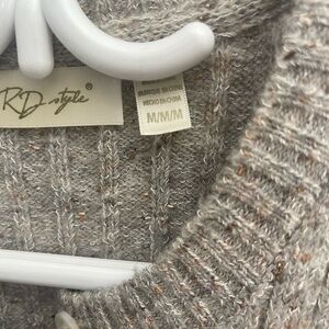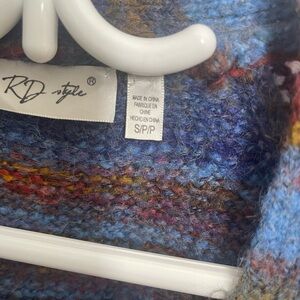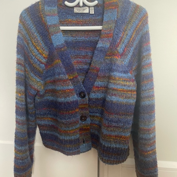 Cozy knit cardigan with V-neck and button front. Soft striped pattern in blue with multicolor accents. Lightweight, fuzzy texture for warmth and style. Easy to layer over tees or dresses.