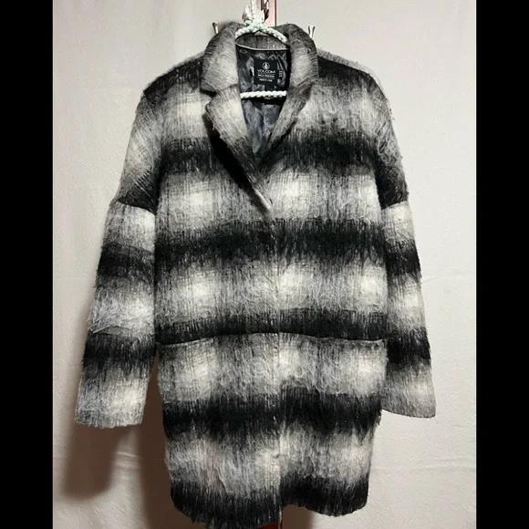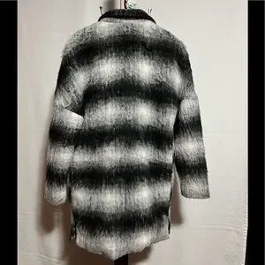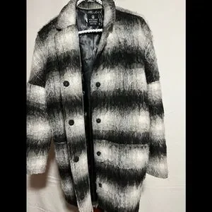 Comfortable lined and cozy sweater jacket can be dressed up or worn casual. Large hidden snap closure keeps the jacket in place. The size says xs-s but can easily be worn by a medium. Especially if your figure is smaller in the hip area. I had the slits put in by a Seamtress to give a little more hip room as I needed.