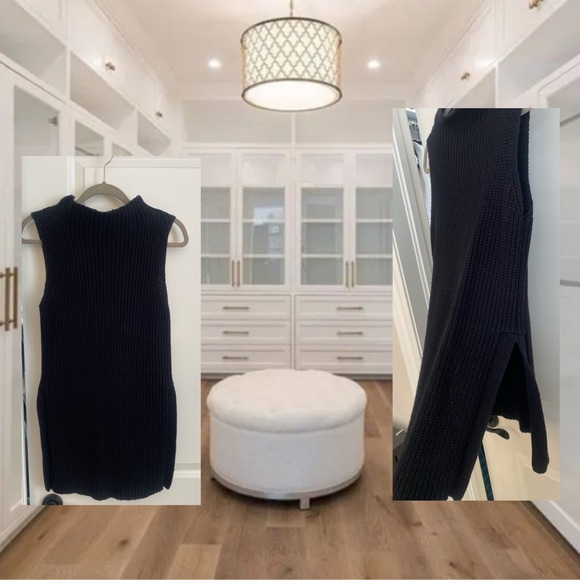 Fitted ribbed, sleeveless, mock neck, with two side slits. This is long in length, falls beneath top to mid thigh - for a chic look pair with tights, utilitarian boot or heels and your fave white boyfriend dress shirt!